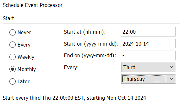 - Monthly - automatically run the event processor repeatedly, once a month, based on the selected time, start and end dates, week of the month, and day of the week. The 'Start at' parameter determines the time of day that the event processor will run. The 'Start on' parameter determines the date the event processor will first run, while the 'End on' parameter determines the date of the event processor's final run. The 'Every' dropdown parameter selections for the week of the month and the day of the week determine when the event processor will run. The selections are summarized at the bottom of the dialog.