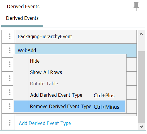 Find the derived event type to be removed, right-click the row icon to display the available options.