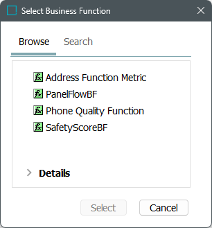 - Select the business function to include as part of the business function metric. To search for a specific business function, click the 'Search' tab and enter the search criteria.