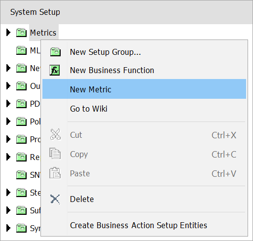 - In System Setup, right-click the Setup Group Root that holds metrics, and then click New Metric.