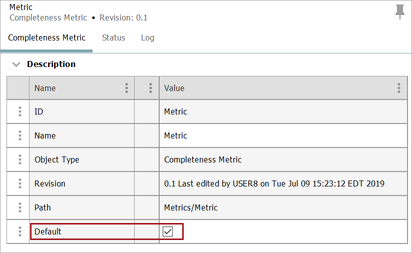 When a metric is set as the default metric, the completeness meter shown on an object's editor tab displays the value from the default metric.