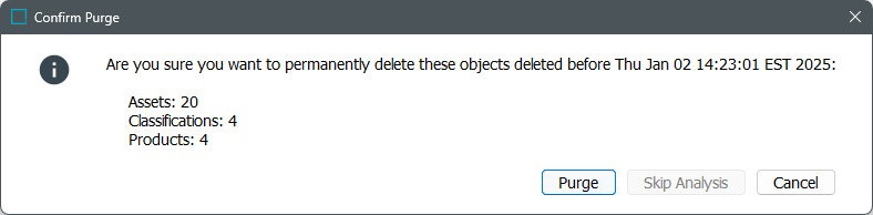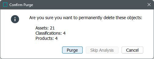 On the Confirm Purge dialog, the Skip Analysis button is enabled while counting the number of objects in the recycle bin. Review the object counts and click Purge to delete them or click Cancel to close without changing the recycle bin.