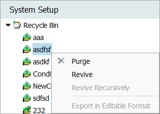 Deleted objects in the System Setup Recycle Bin can be managed as a group from the Recycle Bin node or individually.