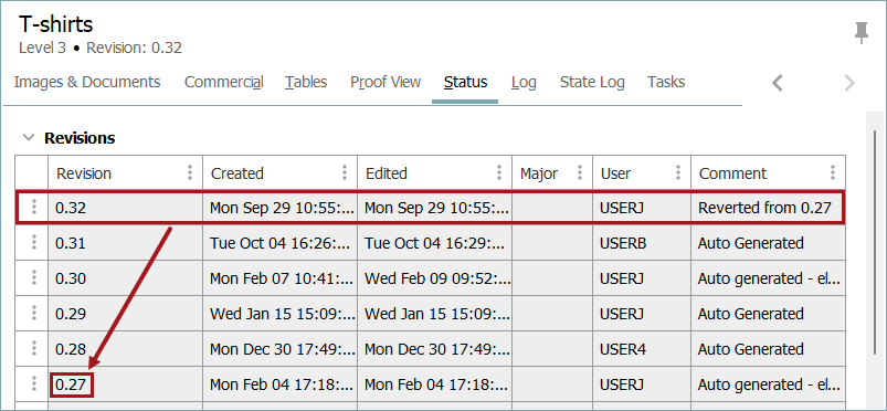 To track the history of the object, an automatic comment includes the revision of the object that has been reverted.