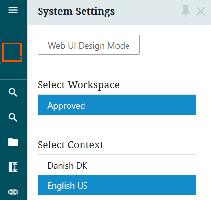 When the user opens Systems Settings in Web UI, they have only Approved below 'Select Workspace', and only Danish DK and English US below 'Select Context'.