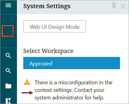 When there is not an intersection for context between multiple User Groups that the user belongs to, or no intersection between User Groups and Context Global Representation component (although it is not recommended to use this component), the following message is displayed for the user in Web UI System Settings.
