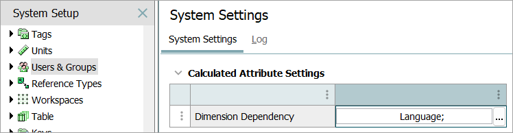 The Calculated Attribute Settings located in System Setup > Users & Groups > Calculated Attribute Settings allows a user to add a dimension dependency to the formula of a calculated attribute. This is useful when text elements are used within a formula. Dimension Dependency allows value templates to differ across contexts by using a different formula template for the same attribute, based on the selected dimension.