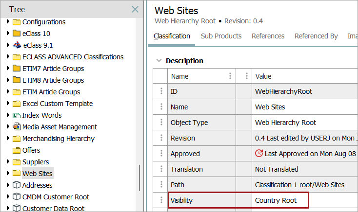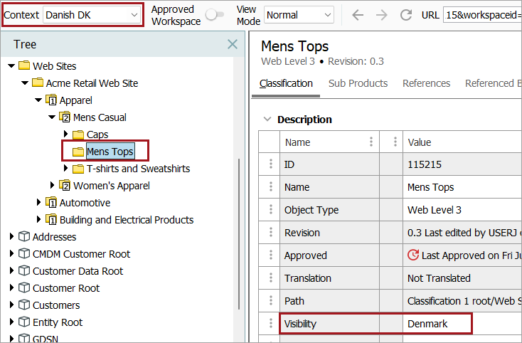 When sub-classifications are visible in another context, this can be found on the References tab of the parent. For example, the Mens Tops classification has Visibility = Denmark. In the Danish DK context, this classification is displayed in the hierarchy.