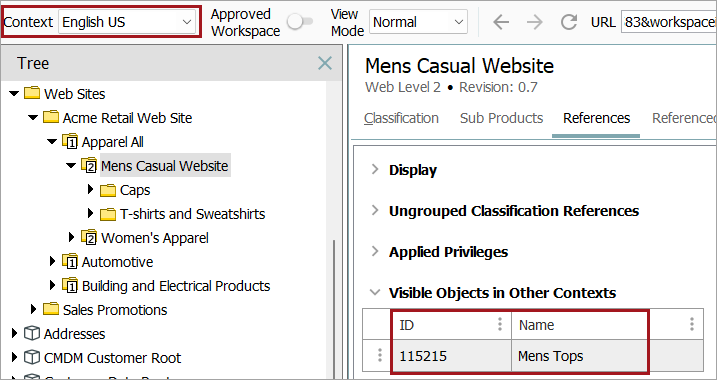Switching to the English US context hides the Mens Tops classification in the Tree. However, if we view the References tab of the parent folder (Mens Casual), the Mens Tops classification is listed under the 'Visible Objects in Other Contexts' section.