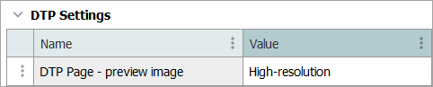 The 'DTP Page - preview image' setting is used to control whether the low-resolution or high-resolution images will be embedded in Flatplanner page previews, which are fetched from the STEP Workbench and generated by the InDesign Server (IDS). This setting is intended to improve the time taken to render page previews. If the setting is changed, the IDS must be restarted before the new setting takes effect.