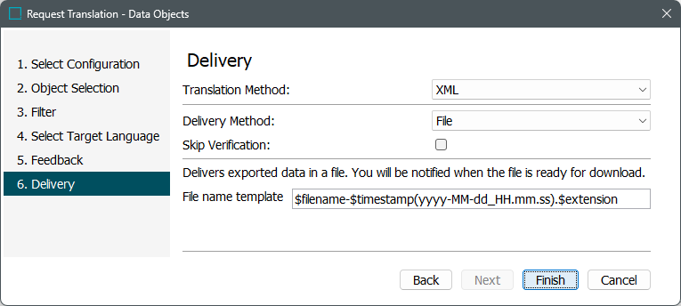 The default file name for an XML translation file exported from STEP is 'translation.xml'. The 'Translation File Pattern' setting allows users to change the file name pattern to something a little more meaningful. The following predefined 'macros' in STEP enable this tailoring: