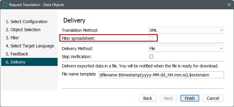 If set to 'Y', the 'Filter spreadsheet:' option displays on the 'Delivery' screen (step 4) of the 'Request Translation' wizard, which is used when starting a translation workflow. If checked, the exported XLS file will only include text entries that require translations.