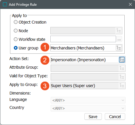 User action Impersonate User enables any user with this privilege assigned to be able to impersonate the selected user group identified in the privilege setup.