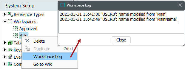 To view the activity and changes that have taken place in a workspace, on System Setup, right-click the workspace and click 'Workspace Log'.
