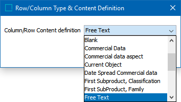 - In the Row/Column Type & Content Definition dialog that displays, choose the relevant content definition from the dropdown list. For most content definitions, a new dialog will display after you make your selection, requiring you to make additional configurations.