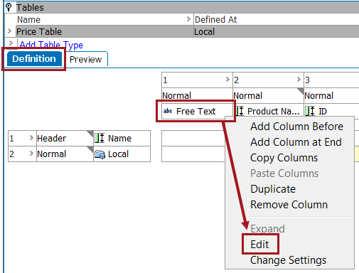 - With your table open on the Definition tab, right-click in the content definition cell on the column or row that you would like to edit, then click Edit. (In the following screenshot, the content definition cell has a preexisting content definition of