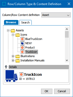 - The Content Definition of the row or column is now set to Asset. The STEP Name of the asset (e.g., TruckIcon) appears in the Content Definition cell on the Definition tab.