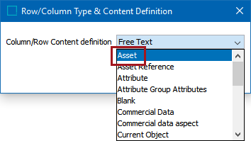 - In the 'Row/Column Type & Content Definition dialog,' select Asset from the Column/Row Content definition list.