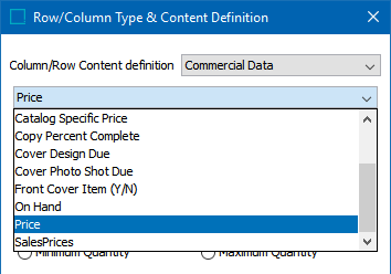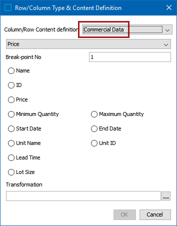 - In the 'Column/Row Content definition' list, select Commercial Data.