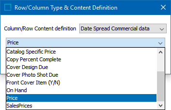 - From the 'Column/Row Content definition' list, select Date Spread Commercial data.