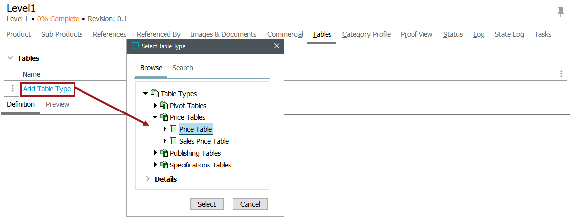 - Browse or search for the relevant table type, then click Select.