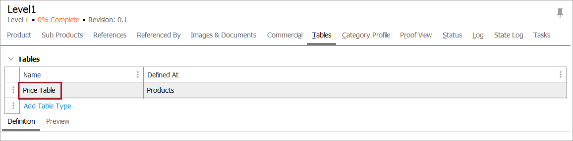 - In the Tree, navigate to the relevant product, classification, or product-override object, then select the Tables tab.