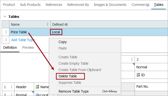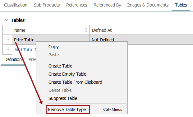 - If the table was defined locally and did not override a table built at a higher level, then Local changes to Not Defined. The table type can then be deleted by right-clicking on the table type and selecting Remove Table Type.