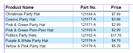 The screenshot below shows a very simple table as previewed in STEP. It incorporates STEP names, STEP IDs, and pricing information. Tables are typically more complex than the sample presented, but even this simple table employs a table transformation (Alternate Row Colors), font styling, and more than one table rule line.