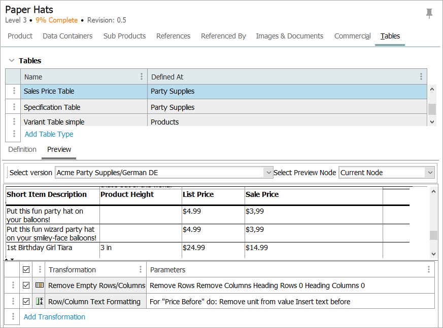 The configuration options available for tables in STEP are extensive. Tables can display attribute values, assets, references, commercial data, free text, and more. Since tables support inheritance, a table can be built once and used for an unlimited number of product presentations. Table layouts and settings can be shared across product, classification, and product-override hierarchies. Table types can be made dimension dependent to display different information for different contexts. Because tables are dynamic product presentations, they will automatically adapt to data changes in the workbench. Additionally, transformations can be applied to tables to perform simple actions like merging common cells, changing the font size / text style, and applying color to the font or to the cell, or for advanced transformations such as the Pivot Table Transformation.