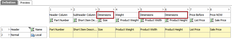 For this topic, the example table has eight columns, which includes the repeating column type of 'Dimensions.' The Dimensions column is a 'Normal Row' column. (Even though the setting is Normal 'Row,' this setting applies to both rows and columns and means that the column / row is not used as a header, a subheader, or a footnote column / row.)