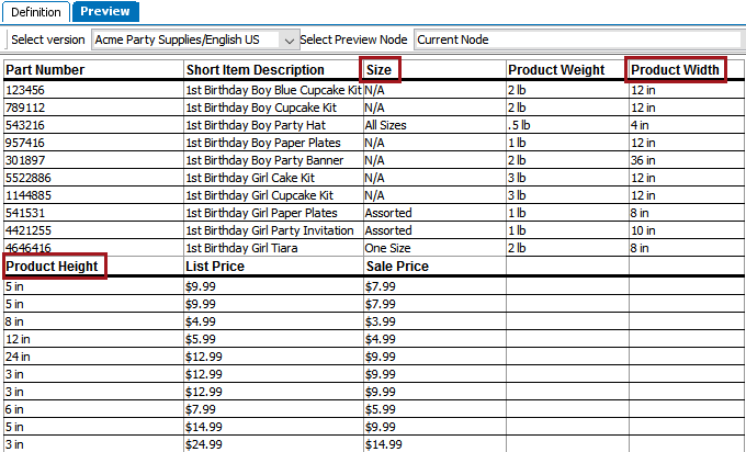 The 'Dimensions' column type is used in three places in the table. The attributes used for the 'Dimensions' column are Size, Product Width, and Product Height.
