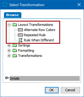 When you add a transformation, you typically need to specify parameters for the transformation to work. The following layout transformations are available and are defined in the sections below: