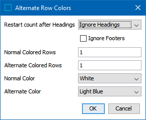 1. In the Restart count after Headings list, select either Ignore Headings, 1, or 2. Selecting 'Ignore Headings' will actually include headings in the row shading. For example, if the Normal Color is blue and the Alternate Color is white, then the header row will be shaded blue if 'Ignore Headings' is selected.