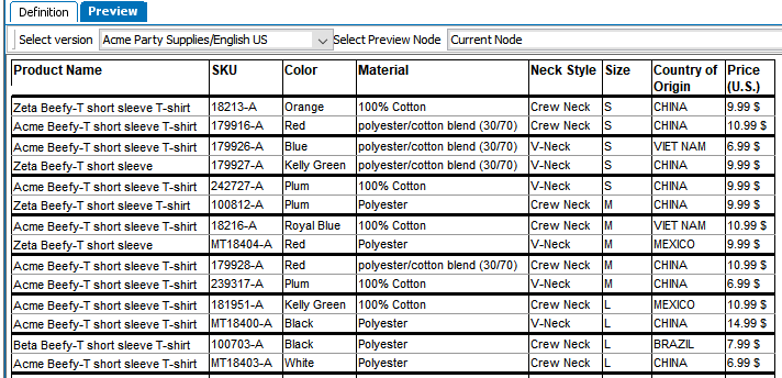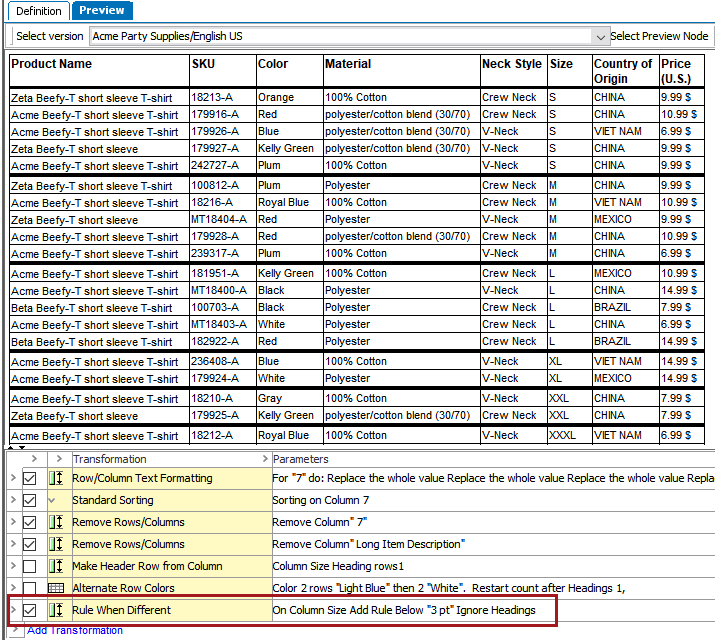 In this example, a 3 pt rule line is added every time a value in the Size column changes, so a 3 pt rule surrounds all size S rows, all size M rows, etc. This is how the table looks before the transformation: