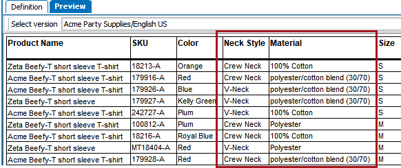In the following example, the 'Neck Style' and 'Material' columns are merged. Though it is common to merge columns or rows that are directly adjacent to one another, any columns or rows can be chosen. E.g., in the below example, 'Product Name' and 'Color' could be merged, and so forth.