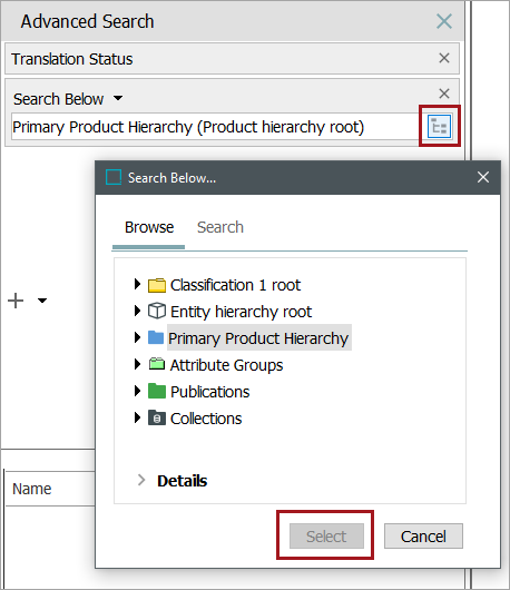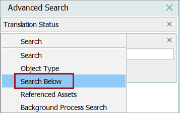 Important: To avoid performance slowdowns when using the Translation Status and Search Below criteria together, users should precisely define which nodes should be selected for Search Below. For example, selecting a root node can potentially result in poor performance for the entire query.