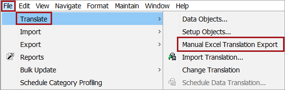To create a Manual Excel Translation Export, open the File menu, point to Translate, and then click Manual Excel Translation Export.