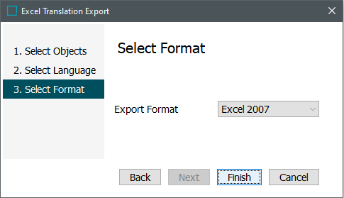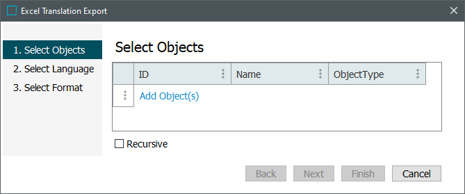 In the Select Objects step, the user may select which objects should be included in the Excel translation file being generated.