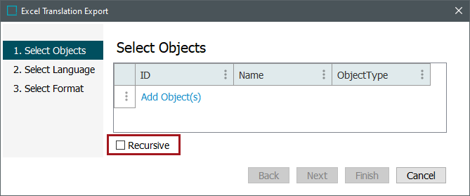 - Additionally, be sure to add a check to the checkbox beside Recursive if all objects that are 'children' to the selected 'parent' object should also be included in the Excel translation export.