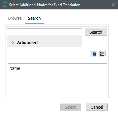 - Click the blue-shaded Add Object(s) text and then, in the Select Additional Nodes for Excel Translation window that displays, use either the Browse or Search functions to locate and select the objects you want to translate.