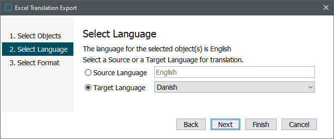 The Manual Excel Translation Export allows for one language to be targeted for each export file produced. The Select Language step allows the user to choose either a source language or a target language as the language they export the Excel to translate into.
