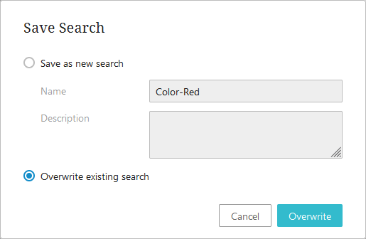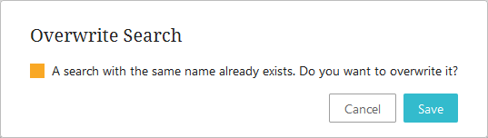 If saving a new search using a name that is already used by an existing saved search, an overwrite notification will appear and require user action. If overwriting a search that has been previously shared, the search is overwritten for all users.