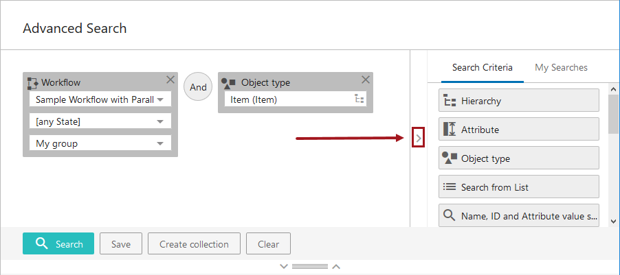 The individual panels on the Advanced Search screen are collapsible and expandable through the use of a collapsible splitter feature, which consists of a drag handle element and two arrows, one pointing up and one down. This feature is shown below: