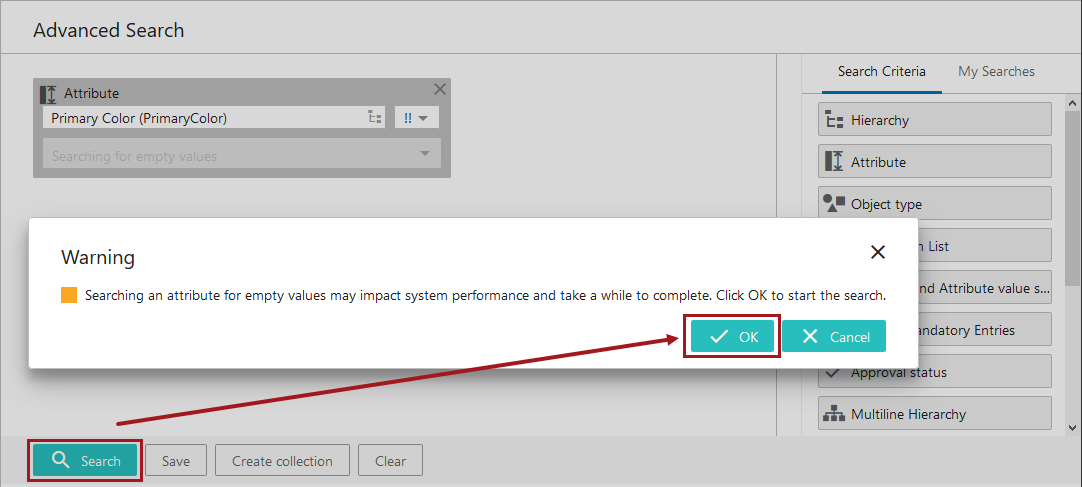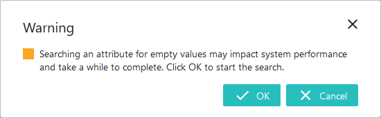 Searching for Empty Values: Using the Attribute criterion for searching (! and !! operators) attributes that have empty values is an easy way to identify objects in STEP that are not yet complete. However, performing these searches can be time consuming depending on the number of attribute values being searched and the complexity of the assembled search criteria. Because of this, when starting an empty-value search (either alone or with other criteria), users are presented with a message asking them to confirm that they want to move ahead given the potential resource and time constraints. When the end user clicks OK, the search is performed. The maximum number of search results returned is 10,000.