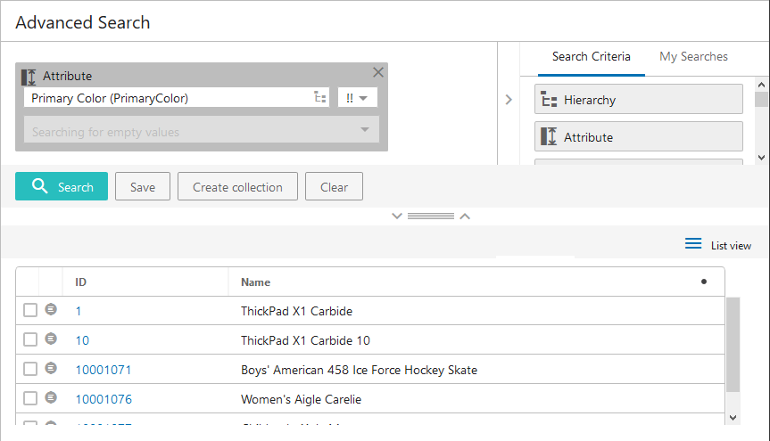 Searching for Multiple Values on Multivalued Attributes: By default, the Attribute criterion assumes an OR operator for the multiple values the user inputs. This means that the search result will include a product or entity having any one of the input values. This also applies to attributes searched within data containers. Refer to Example 5 below.
