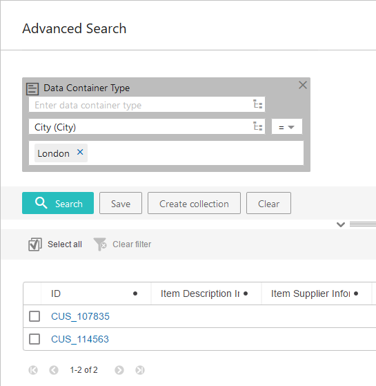 )', in this example), enters an attribute value in the 'Select options' field, and then clicks Search, a list of all entities with an attribute value that matches the value specified for the selected data container-linked attribute will populate. By leaving the 'Enter data container type' field blank, the user is searching for attribute values within any existing data container.
