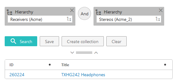 To find products linked in two different classifications, add a [Hierarchy] search criteria to the search panel, and set it to the first classification to be searched. In this example, the classification is 'Receivers (Acme)'. Then add a second [Hierarchy] search criteria, and set it to the second classification to be searched, which is 'Stereos (Acme_2)'. Then click ' Search'.