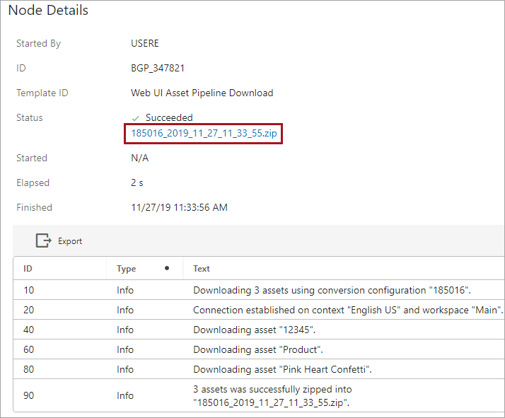 On the background processes screen, the process is shown to finish with a link available to download the zipped package of assets.