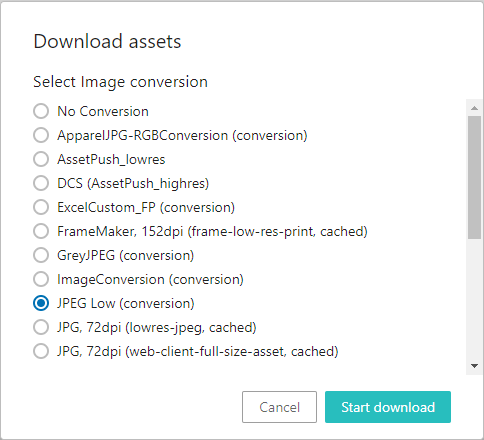 Any number of the assets are selected, and then, the Download Assets action is selected and a conversion option is available in the dialog. It is not required, and the current format of the images in the system will be downloaded when 'Start Download' is selected.