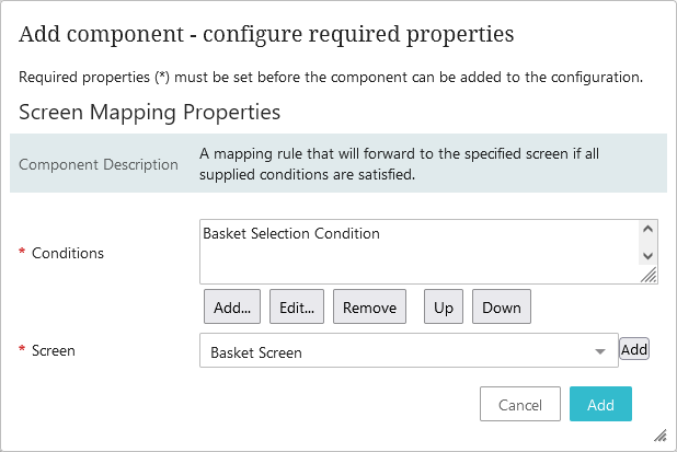 Select the Basket Selection Condition. In the Screen parameter dropdown, choose the Basket Screen you created in the previous steps. Click, Add. Save and close the designer.